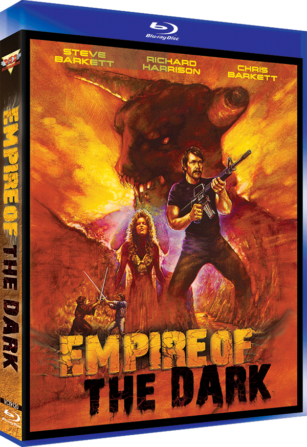 20 years ago police officer Richard Flynn (Steve Barkett) stepped through a swirling vortex into another dimension to try and save the woman he loved and her infant baby from being sacrificed in a satanic ritual. The baby’s mother, Angela (Terry Hendrickson), perished. Or did she? 20 years later, the infant, now a young man, is being pursued again by the same sinister figures Flynn killed that evil night. These ‘immortals’ (Richard Harrison & Dan Speaker) must have the boy’s life to complete the sacrifice they began 20 years ago, a ritual that will release upon the earth a legion of ancient demons. Together Flynn and the boy set out on a journey that will take them over rivers of lava, through underground caves stretching hundreds of miles and on through the very gates of Hell! Along their treacherous path, the two must face giant demons, and a legion of soldiers of the Army of Darkness. They fight with ancient swords and automatic weapons to destroy the cult before it can unleash an ancient unstoppable evil that will destroy the entire world! The Empire of the Dark!